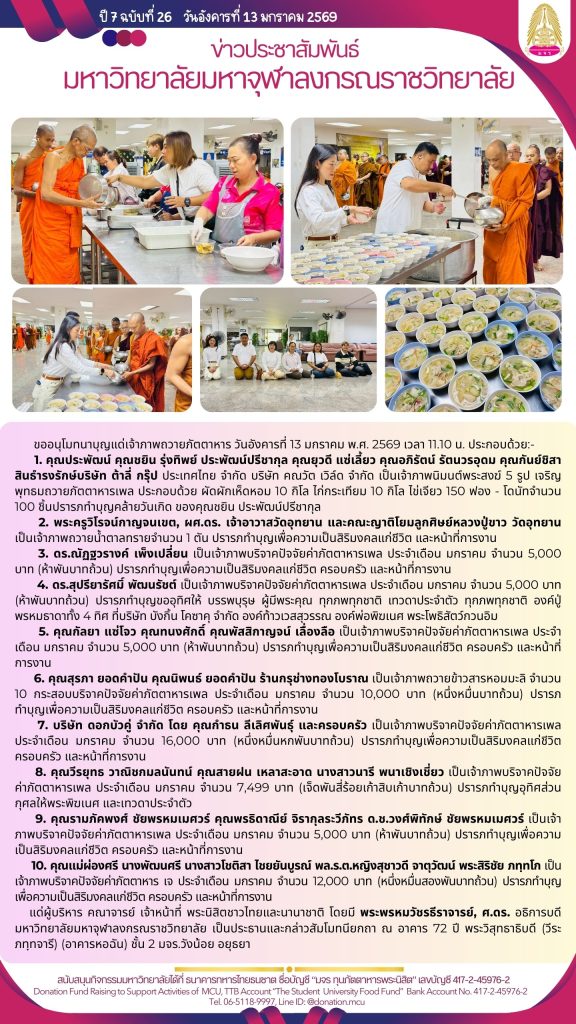 ขออนุโมทนาบุญ แด่เจ้าภาพถวายภัตตาหาร แด่ผู้บริหาร คณาจารย์ เจ้าหน้าที่ และพระนิสิต มจร ประจำเดือนมกราคม 2569