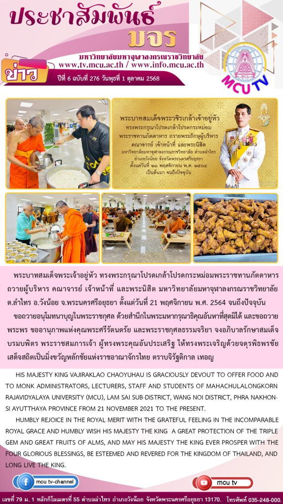 พระบาทสมเด็จพระเจ้าอยู่หัว ทรงพระกรุณาโปรดเกล้าโปรดกระหม่อมพระราชทานภัตตาหาร ถวายผู้บริหาร คณาจารย์ เจ้าหน้าที่ และพระนิสิต มหาวิทยาลัยมหาจุฬาลงกรณราชวิทยาลัย ประจำเดือนตุลาคม 2568