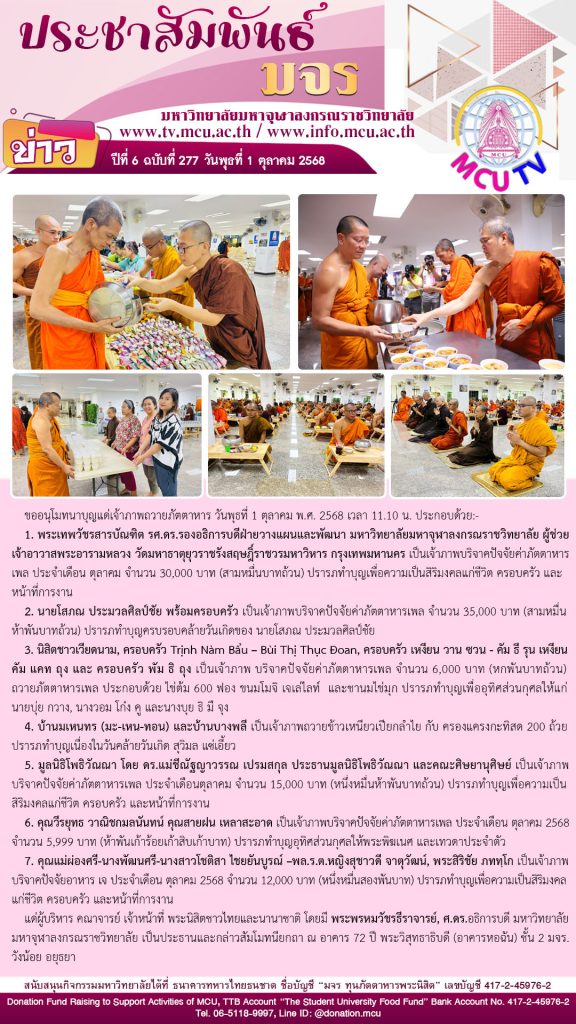 ขออนุโมทนาบุญ แด่เจ้าภาพถวายภัตตาหาร แด่ผู้บริหาร คณาจารย์ เจ้าหน้าที่ และพระนิสิต มจร ประจำเดือนตุลาคม 2568