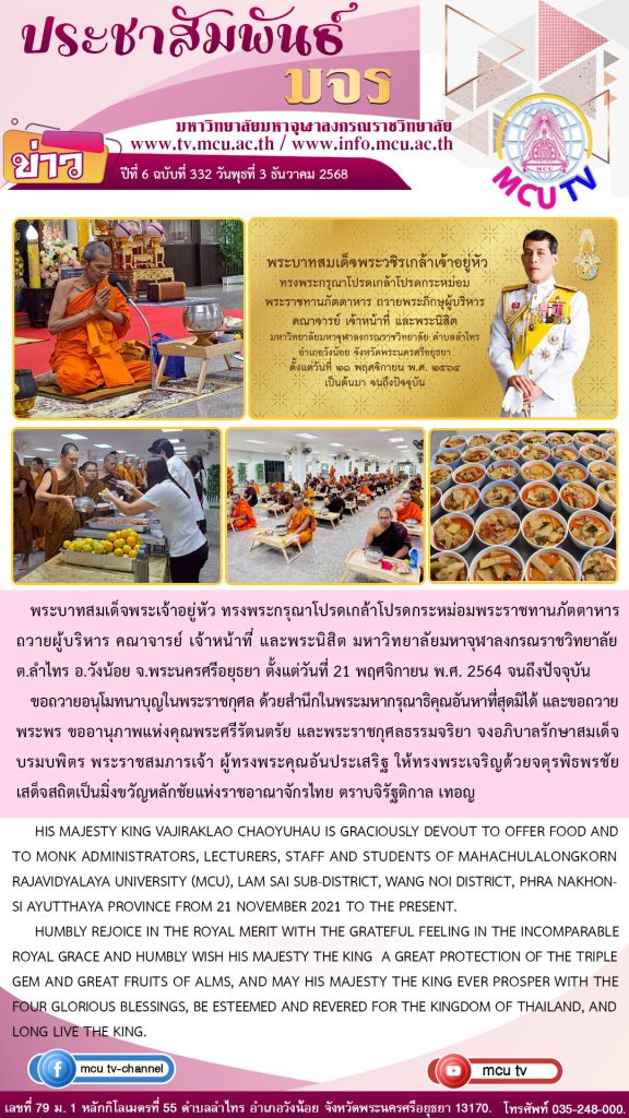 พระบาทสมเด็จพระเจ้าอยู่หัว ทรงพระกรุณาโปรดเกล้าโปรดกระหม่อมพระราชทานภัตตาหาร ถวายผู้บริหาร คณาจารย์ เจ้าหน้าที่ และพระนิสิต มหาวิทยาลัยมหาจุฬาลงกรณราชวิทยาลัย ประจำเดือนธันวาคม 2568