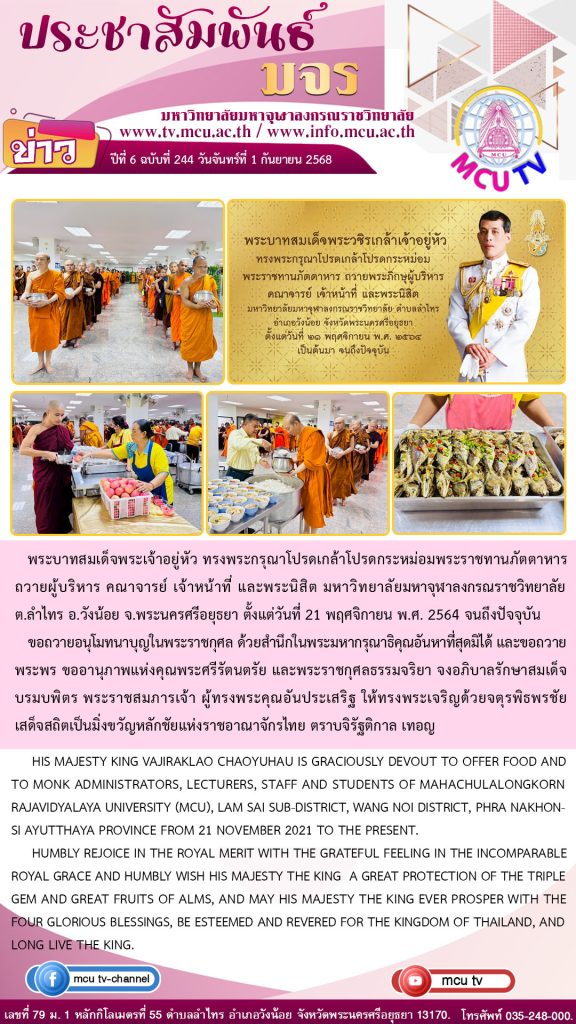 พระบาทสมเด็จพระเจ้าอยู่หัว ทรงพระกรุณาโปรดเกล้าโปรดกระหม่อมพระราชทานภัตตาหาร ถวายผู้บริหาร คณาจารย์ เจ้าหน้าที่ และพระนิสิต มหาวิทยาลัยมหาจุฬาลงกรณราชวิทยาลัย ประจำเดือนกันยายน 2568