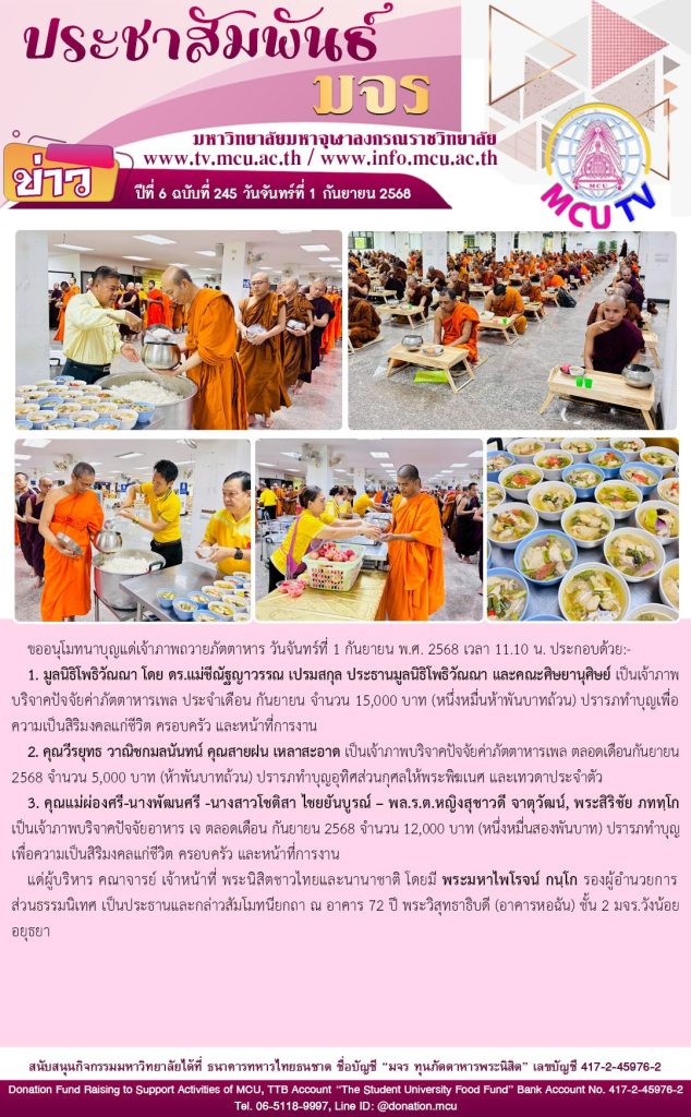 ขออนุโมทนาบุญ แด่เจ้าภาพถวายภัตตาหาร แด่ผู้บริหาร คณาจารย์ เจ้าหน้าที่ และพระนิสิต มจร ประจำเดือนกันยายน 2568